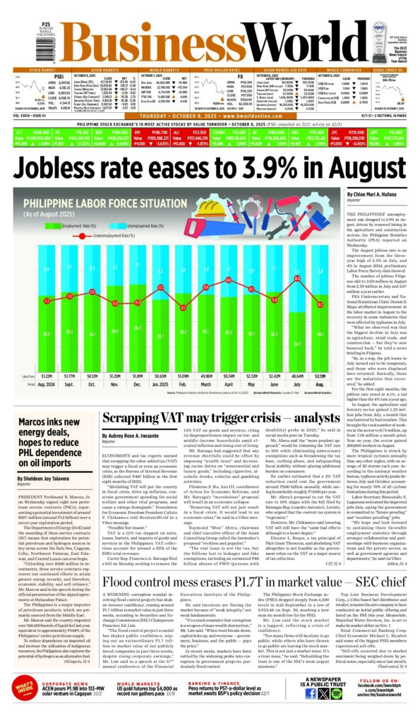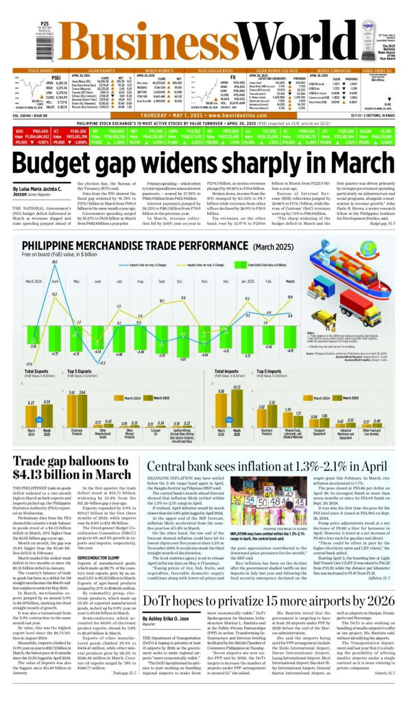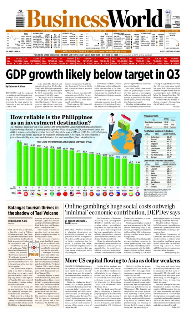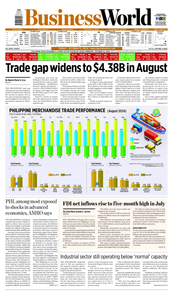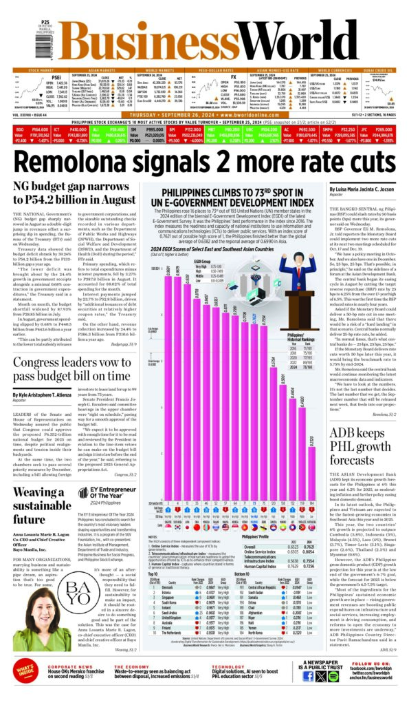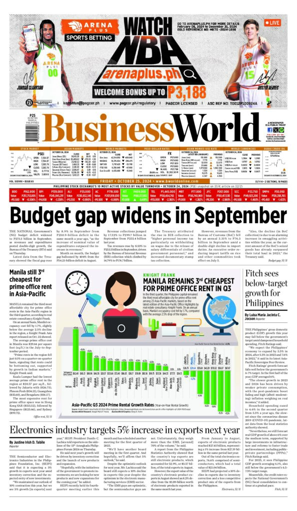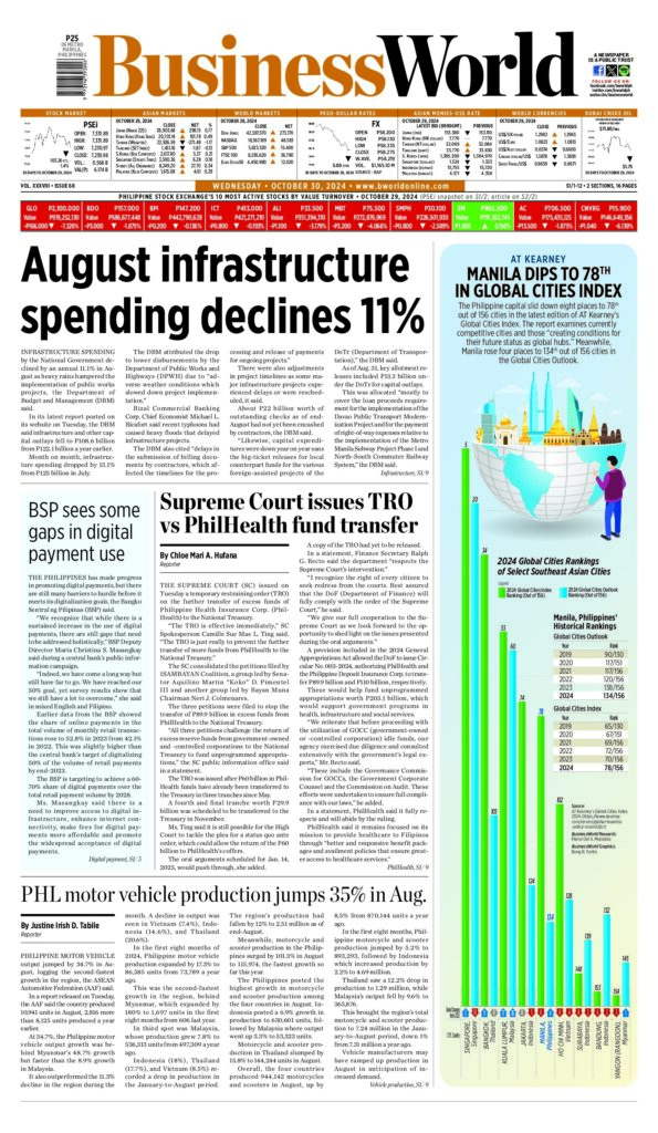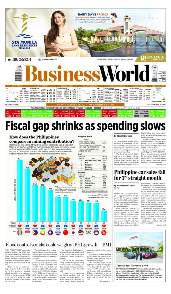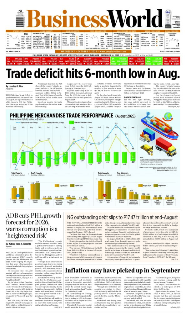 The fiscal gap shrank 9.22% year on year to P248.1 billion, while month on month, it nearly tripled from August’s P84.8-billion shortfall. Total government spending dropped 7.53% to P529.8 billion from a year earlier, reflecting a slowdown in project implementation.